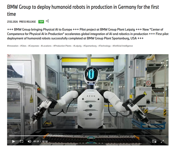 快科技2月27日消息,宝马集团宣布将在德国莱比锡工厂部署人形机器人,这是其首次在欧洲生产体系中引入此类具身智能技术。