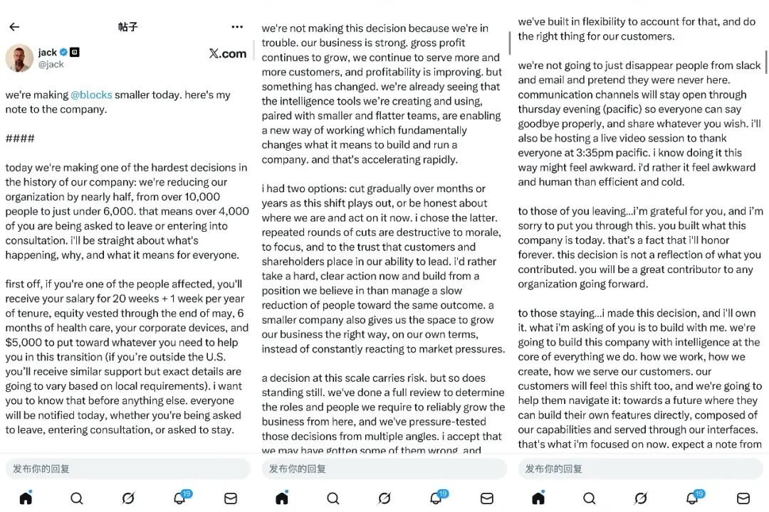 它之所以如此值得我们分析,是因为杰克·多西把裁员从一轮常见的成本收缩,转成一次组织形态的重算,超越了传统裁员现象的套路与范畴。