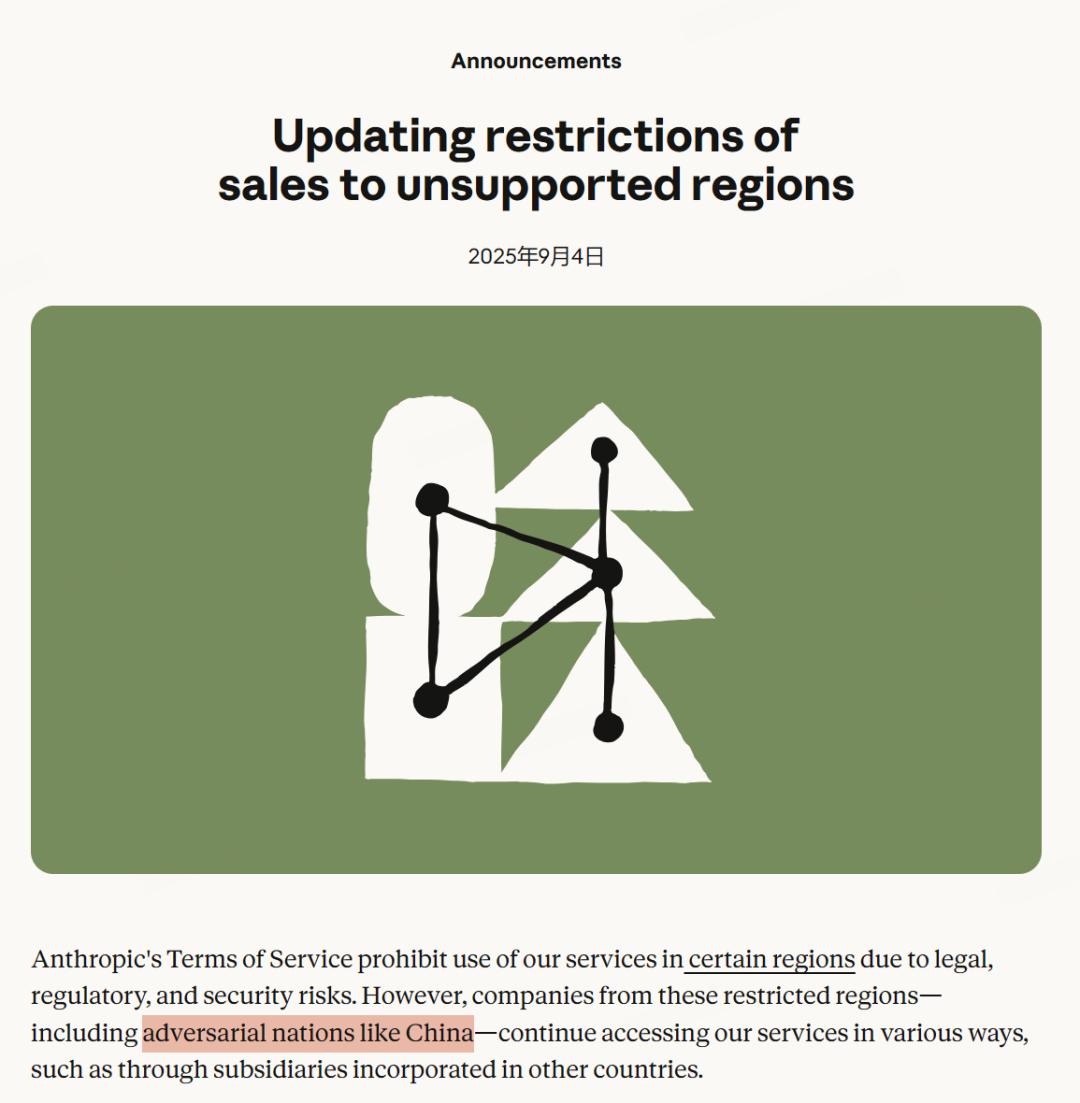 去年9月,Anthropic官方发文,要加强对不支持地区的销售限制。公告点名针对“中国这样的敌对国家”,不仅限制直接访问,还把禁用范围扩大到“由不支持司法辖区(如中国)控制”的公司——即便注册在新加坡或美国,只要其直接或间接被“总部在不支持地区”的公司持股超过50%,也会被禁止使用包括Claude在内的商业服务(包含开发者/API场景)。