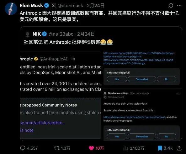 要说违法,Anthropic自己才劣迹斑斑。也正因如此,Anthropic才被AI圈子群嘲。马斯克也评论了这件事,称Anthropic曾因大规模盗取训练数据,最后不得不支付十几亿美金的和解金。