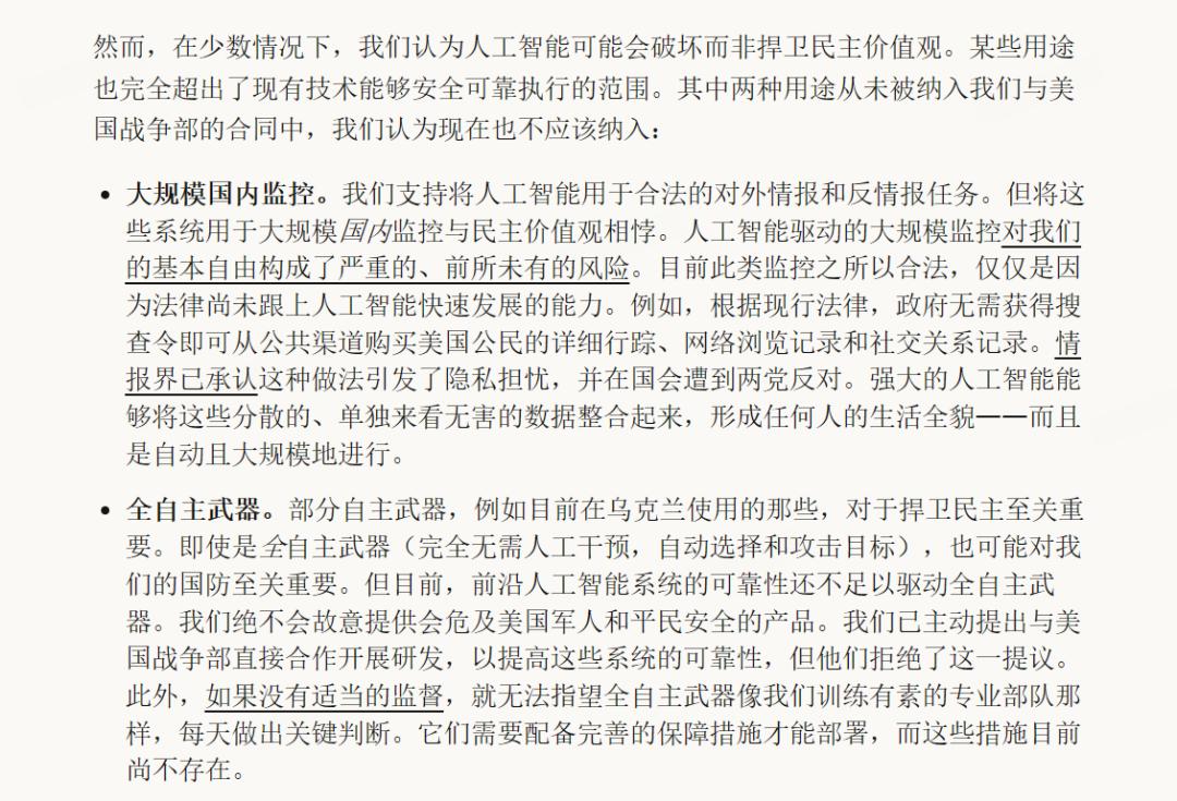 面对国防部“任何合法用途”的要求,Anthropic明确表示拒绝,并点名坚持不用于大范围国内监控(Mass domestic surveillance)和完全自主武器(Fully autonomous weapons)。