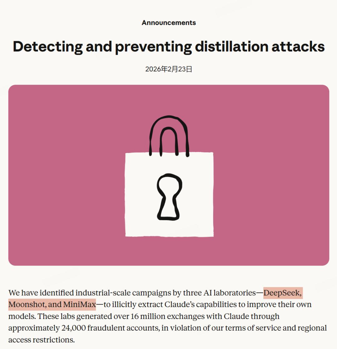 上周一,Claude的公司Anthropic发文公开指控三家中国AI公司DeepSeek、Moonshot(Kimi的母公司)、MiniMax对Claude发起了“工业规模”的能力抽取:这些实验室通过约2.4万个欺诈账户与Claude进行了超过1600万次交互,违反了服务条款和区域访问限制。