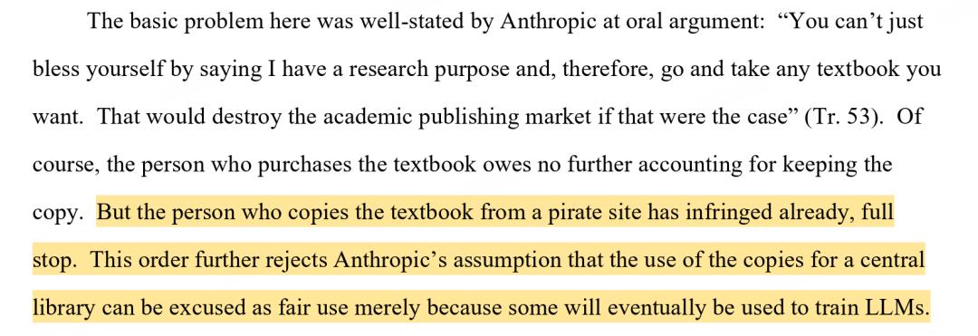 去年9月,Anthropic被发现从盗版网站LibGen和PiLiMi下载了超过700万本书,用来训练Claude。不仅如此,他们还要用这些书建立一个巨大的中央图书馆、意图永久保存。最终,Anthropic支付了超过15亿美金,达成了最终的和解,但和解协议协议不包含“承认不当行为”。这应该是美国版权诉讼史上最大的和解金额案例了。
