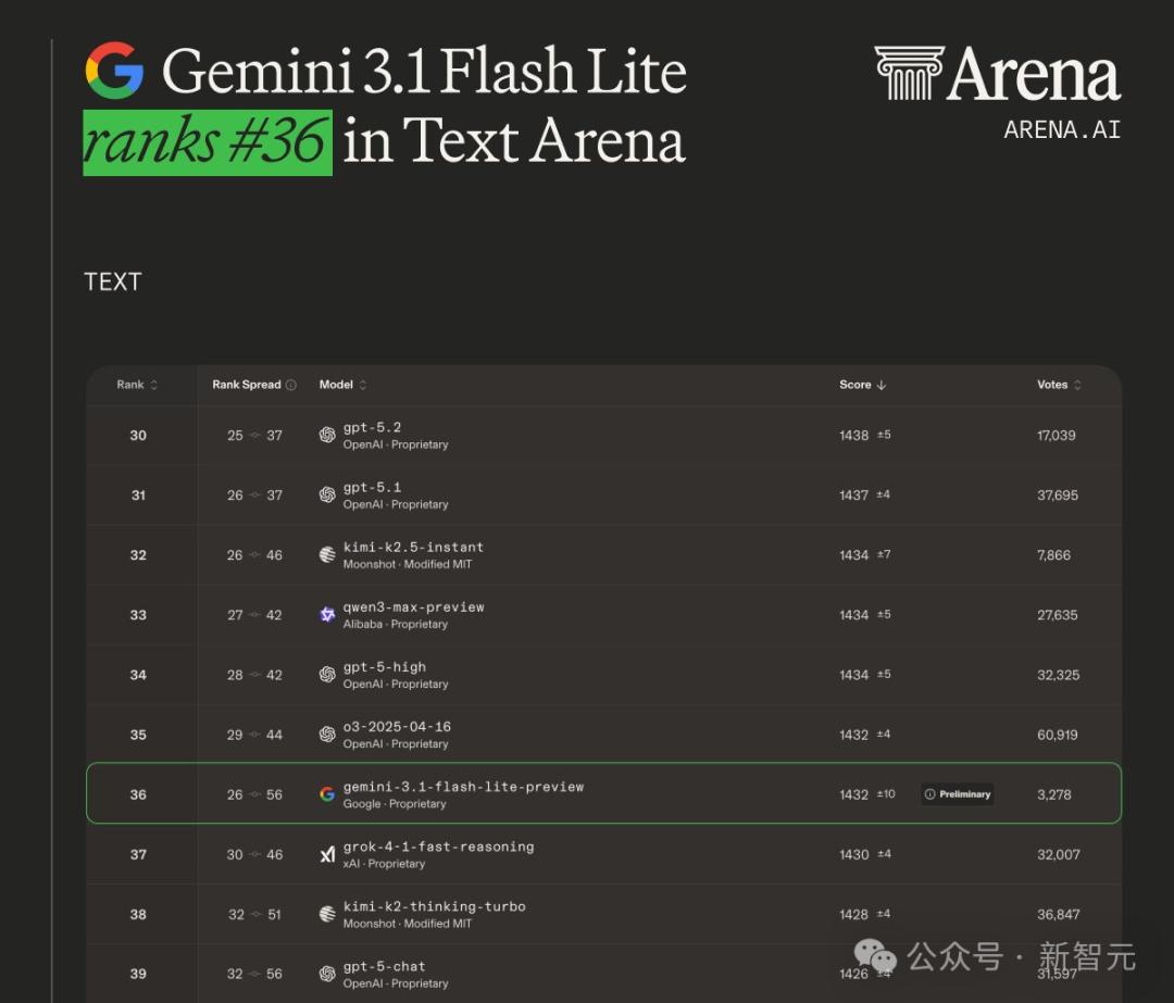 在Chatbot Arena的文本竞技场中,3.1 Flash-Lite以1432的Elo分数排名第36。
