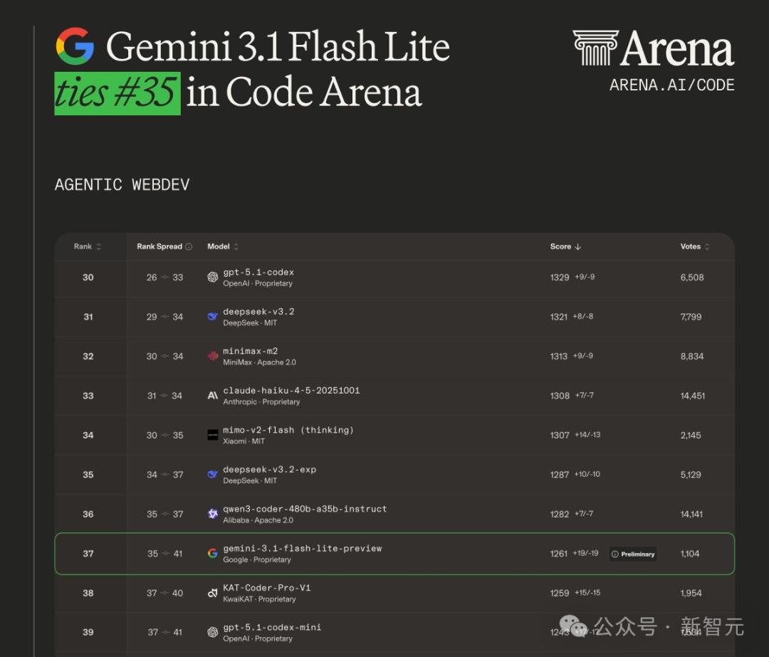 在代码竞技场中,3.1 Flash-Lite得分1261,排名并列35。