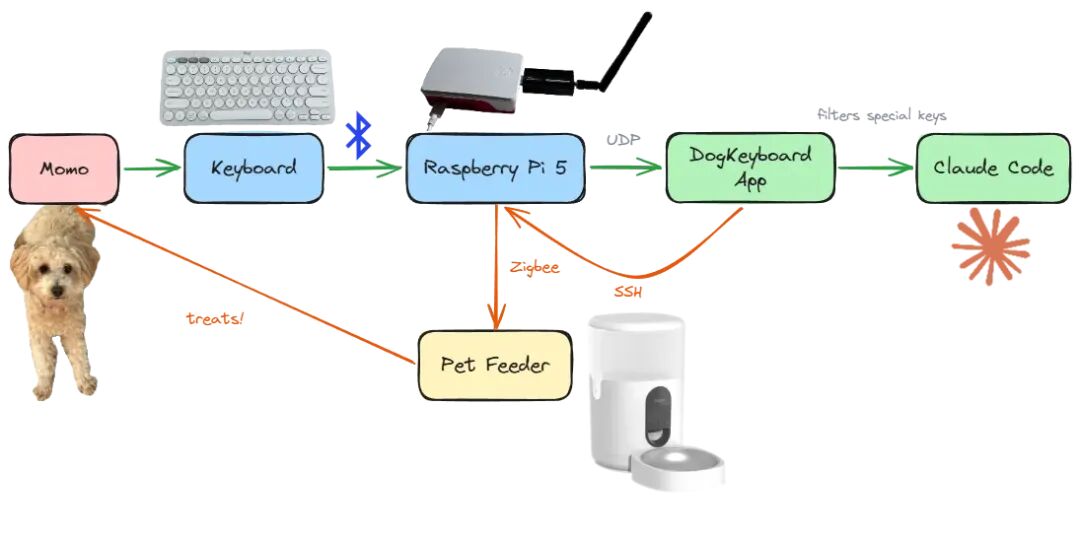 等 Momo 按的按键数量够多了,DogKeyboard 就会触发智能喂食器,给 Momo 发零食当奖励。同时还会响起一声提示音,告诉 Momo 可以继续按键盘,因为 Claude 已经准备好接收更多输入了。
