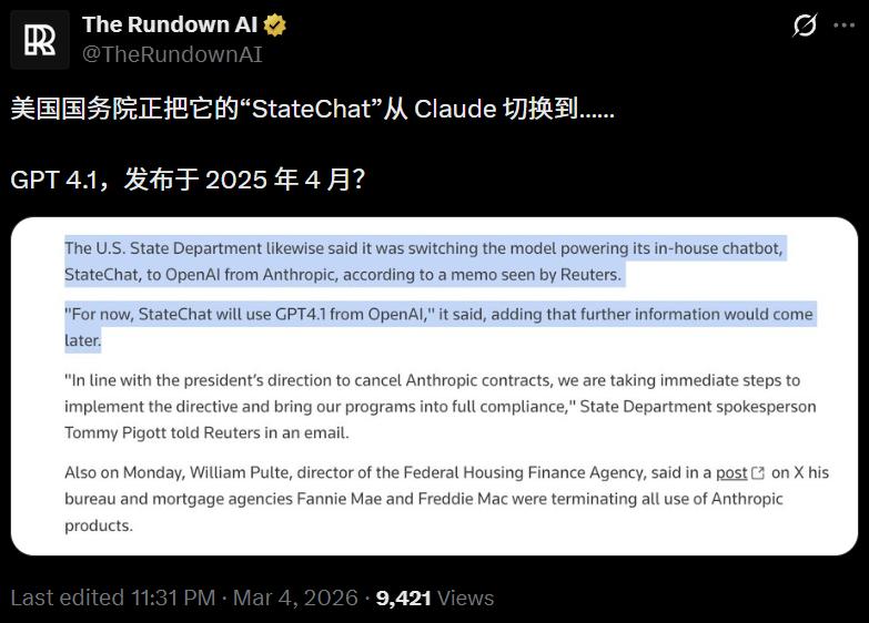 甚至,连美国国务院自研的聊天机器人——StateChat,紧急将Claude切换到了GPT-4.1。