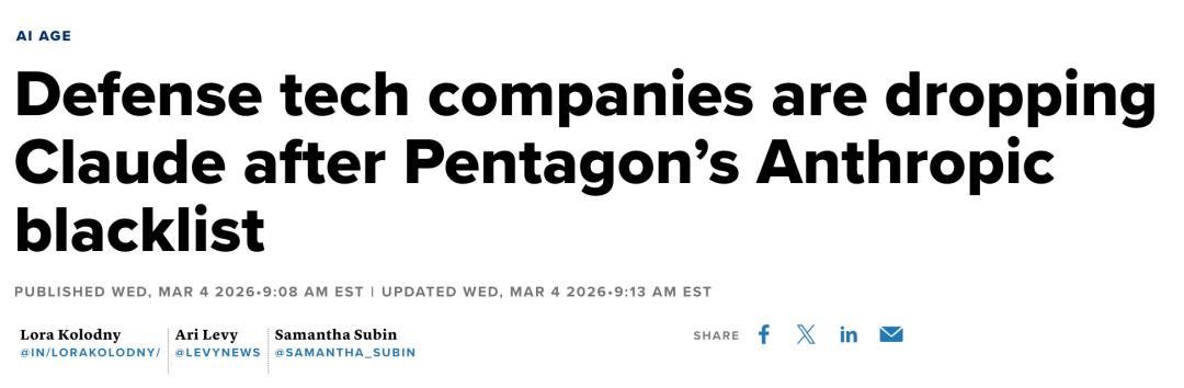 一大批国防科技公司,为了抓住手里的政府订单,已全面向员工下令停用Claude,转向其他LLM。