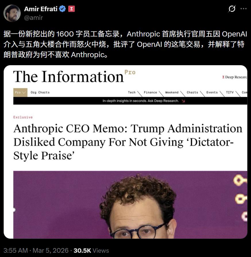 这份长达1600字的备忘录,句句释放出了Amodei现在的焦虑。