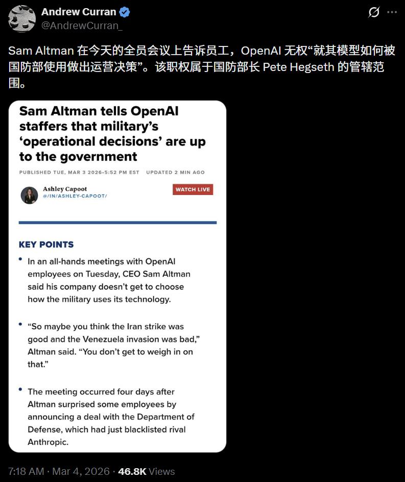 奥特曼也在内部全员会上表示,国防部具体如何使用GPT模型,OpenAI无权做出决策。