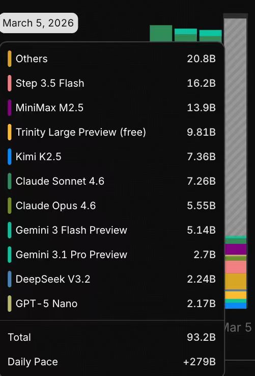 凤凰网科技讯 3月5日,昨日全面开源后,阶跃星辰新一代基座模型Step 3.5 Flash的全球热度进一步攀升,模型调用量在OpenClaw(被网友称为“小龙虾”的全球知名开源项目)上已迅速攀升至全球第一。前五名中,紧随其后的是MiniMax M2.5、Trinity Large Preview(free)、Kimi K2.5,以及Claude Sonnet 4.6——来自中国大模型创业公司的基座模型占据了过半席位。