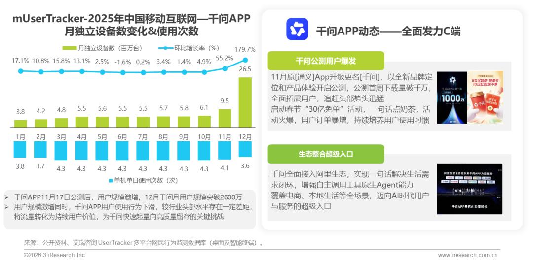 2025年11月,[通义]升级更名[千问],全面发力C端,公测首周下载量破千万,12月实现月设备数破两千六百万,增长势头迅猛,全力追赶行业头部AI应用,用户规模爆发式扩张的同时,用户使用行为出现下降,暴露用户交互深度仍有提升空间;千问深化实用战略,全面接入阿里生态,实现一句话解决生活需求智能闭环,覆盖电商、本地生活等领域,构建AI时代连接海量用户与丰富服务的超级入口。