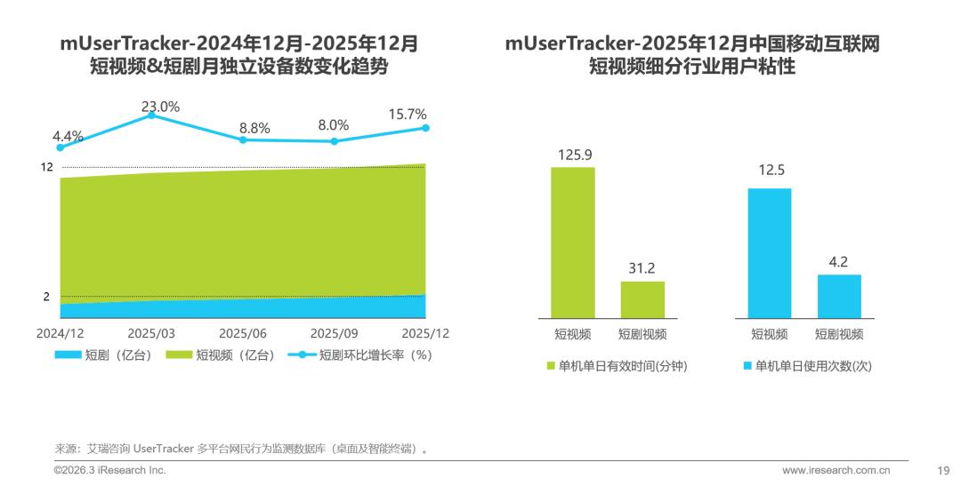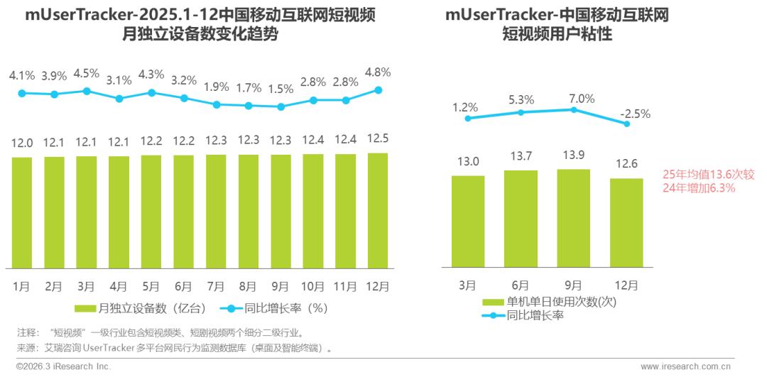 2025年,短视频月独立设备数突破12亿,在规模高位基础上实现平稳增长,短剧视频展现出强劲的增长爆发力,月独立设备数突破2亿台,全年增长约1亿台,成为驱动行业增长的关键增量;同时,短视频与短剧两大细分行业的用户粘性全年均稳居高位,行业持续契合用户核心使用偏好,行业发展势能强劲。