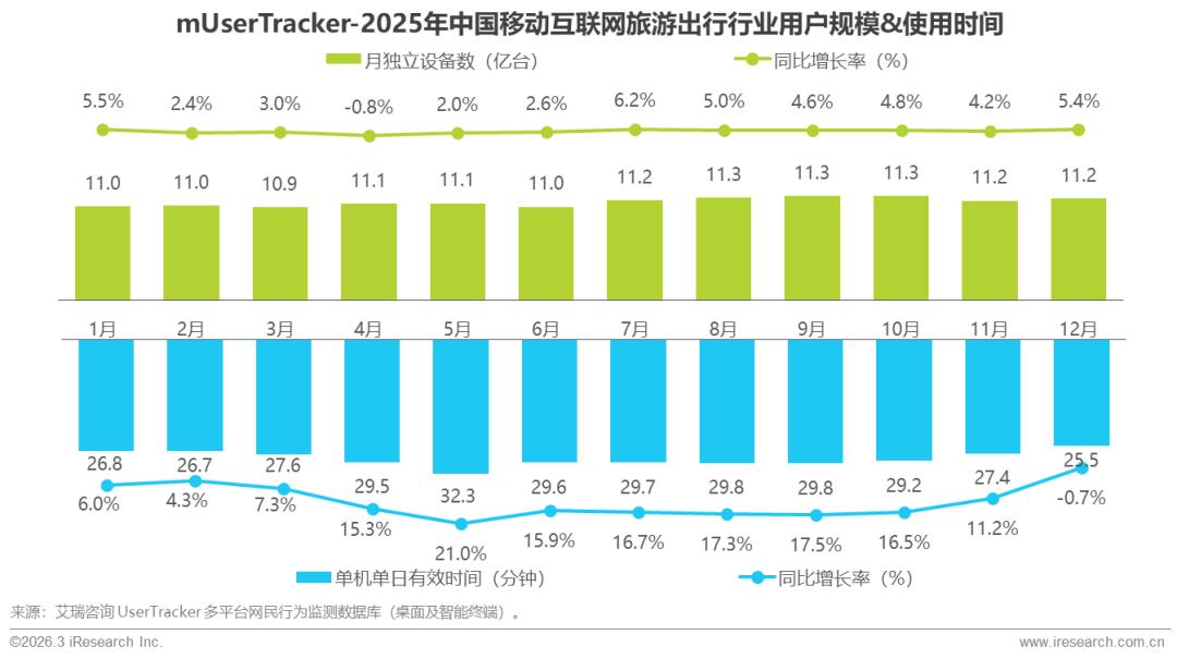 2025年,中国移动互联网旅游出行行业整体呈稳步增长良好态势,旅游出行应用的用户覆盖范围持续拓宽,行业用户基础不断夯实,为行业发展筑牢坚实根基。在用户使用行为上,用户单日使用时长实现同比正增长,数据变化直观印证了旅游出行行业的内容与服务吸引力持续提升,不断凝聚并深化用户兴趣,带动用户参与度稳步走高。