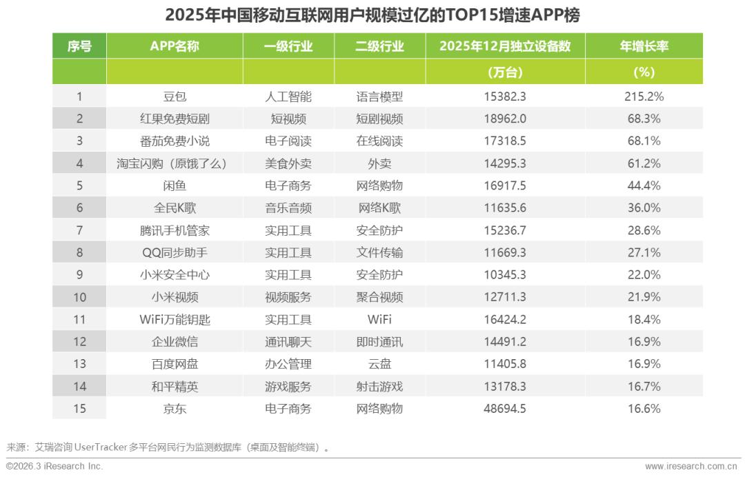 2025年中国移动互联网用户增速榜:移动端用户规模过亿的TOP15增速榜