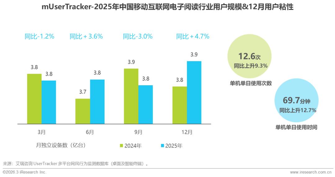 2025年,中国移动互联网电子阅读行业流量回暖,月独立设备数同比整体增长。12月,用户粘性显著增强:人均单日使用时长同比增长12.7%,达到69.7分钟;使用频次同比提升9.3%,增至12.6次。这一趋势反映出用户对高质量、沉浸式阅读体验的偏好日益增强,彰显电子阅读行业AI智能推荐、内容生成、多模态交互、个性化精读等能力普及下,电子阅读内容品质与服务体验的持续优化正有效激发用户深度参与热情。