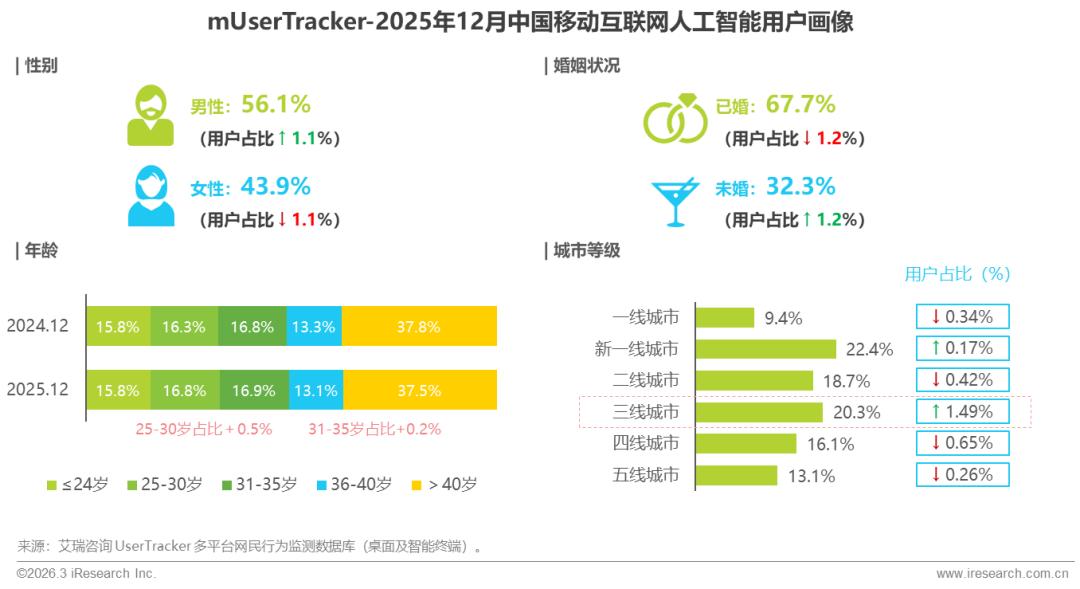 2025年,人工智能技术向各行各业加速渗透,应用场景不断拓宽,用户结构呈现多元化与下沉化趋势,随着轻量化模型普及、移动端体验优化,AI正稳步跨越地域与数字鸿沟,加速向下沉市场渗透,整体用户结构性变化标志着人工智能迈向全民共享新阶段,为构建更具包容性的全民化智能社会奠定坚实基础。