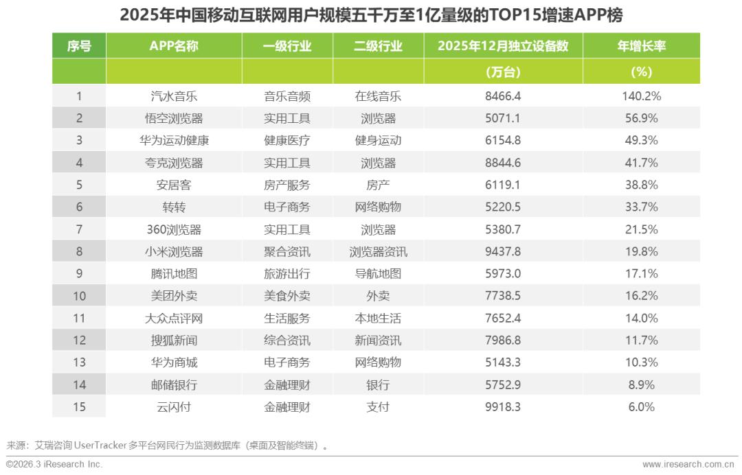 2025年中国移动互联网用户增速榜:用户规模五千万至1亿量级TOP15增速榜