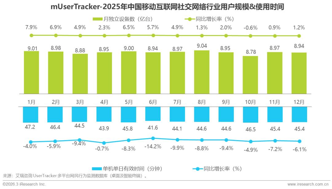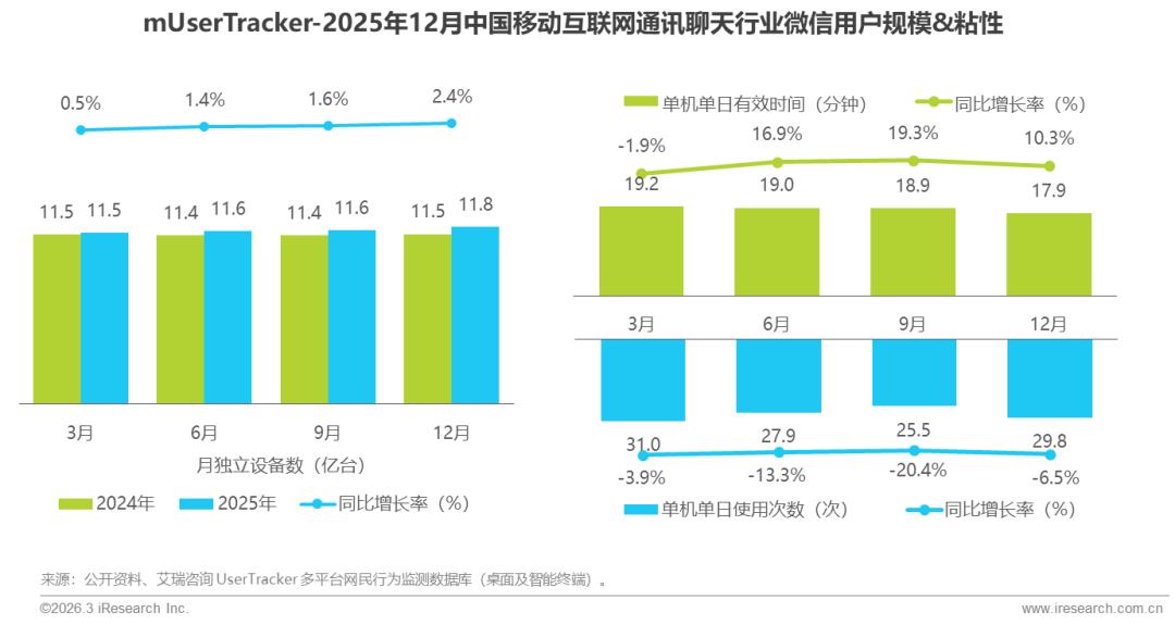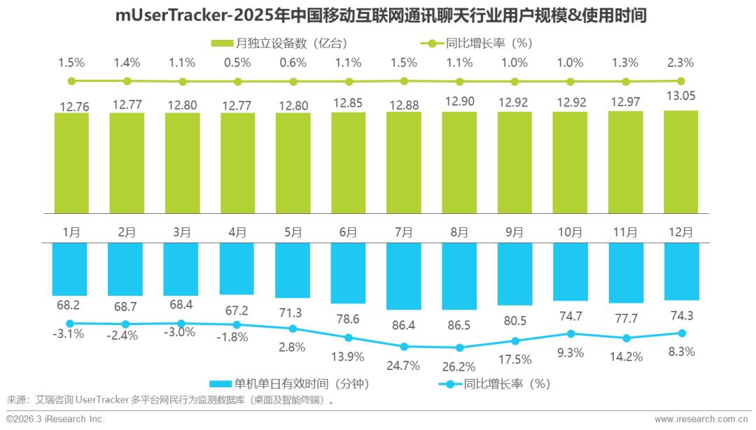 2025年,中国移动互联网通讯聊天行业进入稳固与深化为核心的高质量发展阶段。行业月独立设备数整体缓慢增长,同比增长率始终保持小幅正增长,作为互联网基础应用,用户基本盘极为稳固且仍在持续渗透;用户使用行为上,单机单日有效时间存在阶段性波动,但全年整体实现增长,表明用户对通讯聊天类应用的使用深度持续加深。