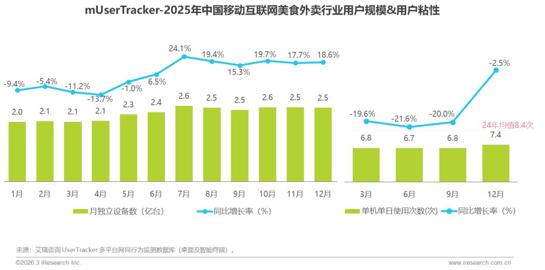 受2025年三大外卖平台激烈竞争影响,美食外卖行业流量在7月达到全年峰值,随后有所回落,整体仍维持高位,月活跃用户规模稳定超2.5亿,显示出强劲的市场基本盘。然而,全年用户粘性出现明显下滑,单机单日使用次数不足7次,反映出用户使用频次趋于饱和;艾瑞咨询认为,用户粘性下滑或源于平台补贴退坡、多平台同质化竞争加剧、用户决策成本上升等多重因素,用户从高频刚需逐渐转向低频比价场景化使用,倒逼行业精细化运营与差异化服务。