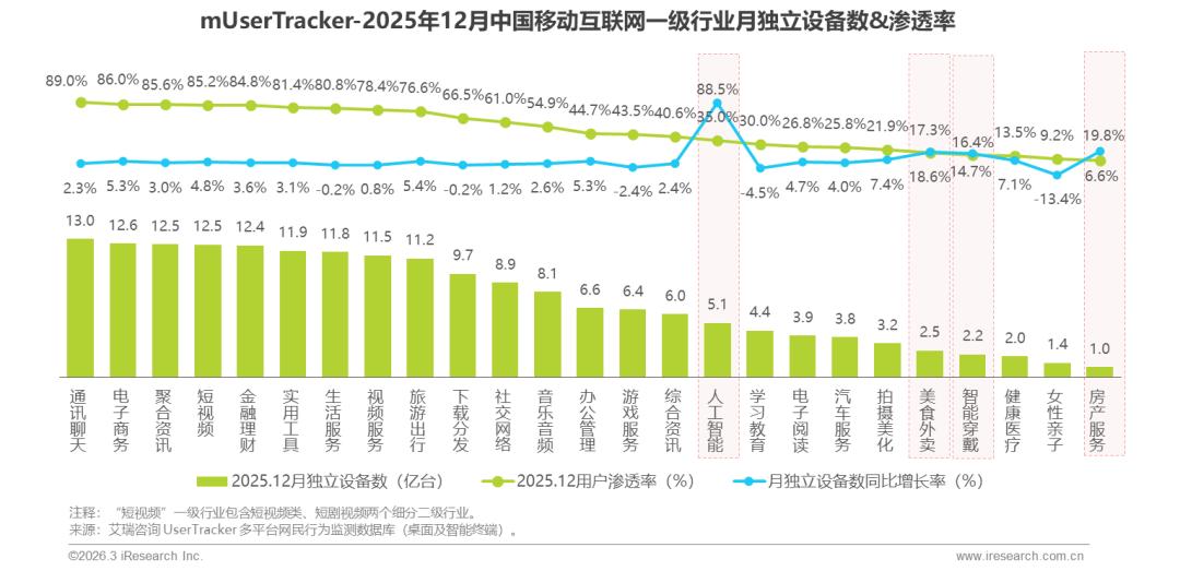 2025年12月中国移动互联网TOP25一级行业中,通讯聊天、电子商务、聚合资讯等头部领域月独立设备数领先,用户渗透率稳居高位,其中通讯聊天领域渗透率达89.0%。部分领域同比增长势头迅猛,人工智能以88.5%的同比增速领跑,房产服务、美食外卖、智能家居也分别实现19.8%、18.6%、16.4%同比增长。行业整体呈头部领域规模与渗透率双高、热点领域增长提速格局。