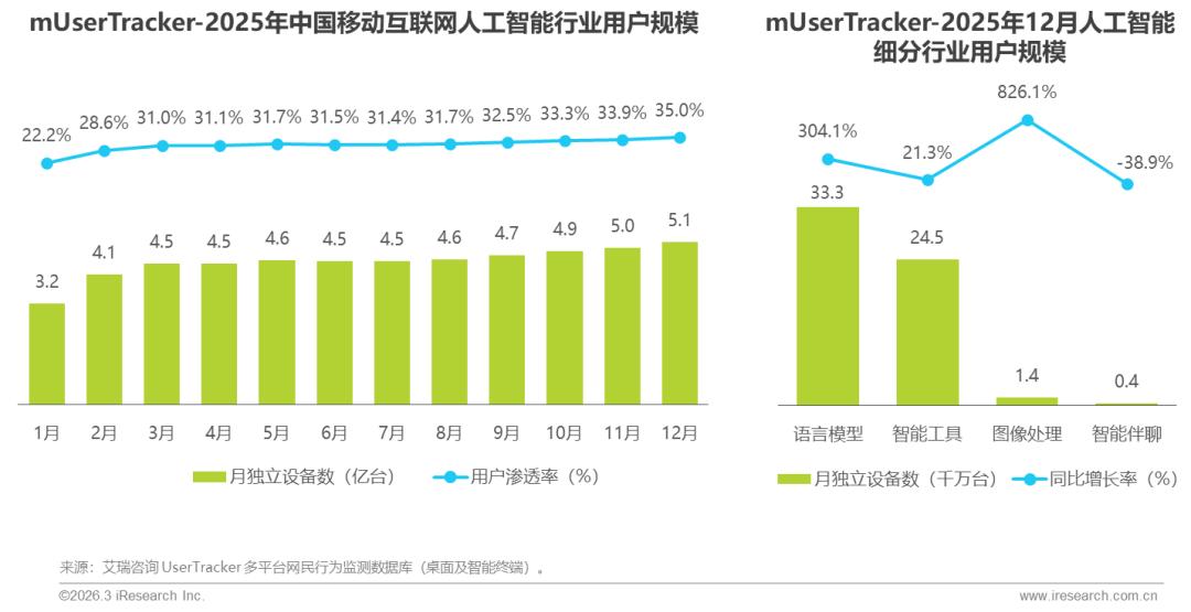 2025年,人工智能行业持续高热,行业流量同比增长超80%,展现出强劲的发展动能,用户渗透率稳步攀升达35%,AI技术从早期尝鲜阶段加速迈入大众普及期。语言模型与图像处理表现尤为亮眼,依托大模型技术的突破与多模态能力融合,用户规模同比激增超300%,成为推动AI落地的核心引擎。这一爆发式增长不仅印证生成式AI的成熟度提升,也标志着人工智能深度融入社会生产与日常生活方方面面。