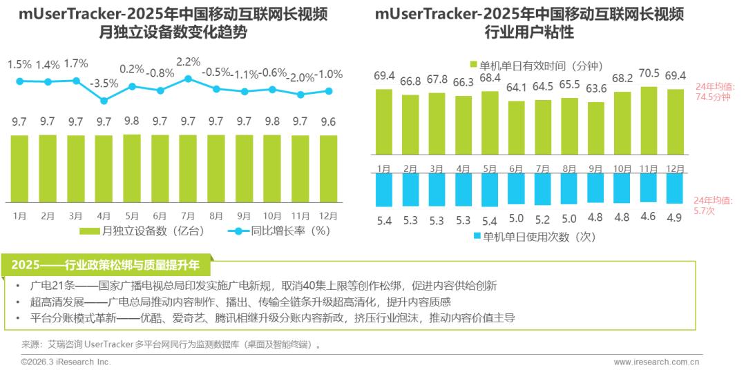 2025年长视频行业月独立设备数整体稳定,窄幅波动,行业流量天花板隐现,受短视频等业态分流冲击,用户粘性下滑显著。广电总局与各大平台积极应对,激发行业活力,从政策与市场双重驱动加速行业变革。艾瑞咨询认为,长视频行业存量竞争下,用户价值深耕为破局关键:当以政策合规为底线、内容创新为核心、以用户价值深耕为抓手,重塑长视频深度娱乐价值。