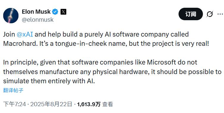 作为背景,马斯克去年8月首度公开宣布“巨硬”(Macrohard)项目,公开叫板软件巨头微软(Microsoft)。
