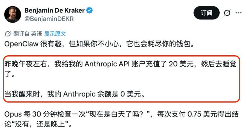 有网友就抱怨过,刚充的 20 刀 Token 余额,想着设定个小任务慢慢跑,结果第二天起床一看,花光了。。。