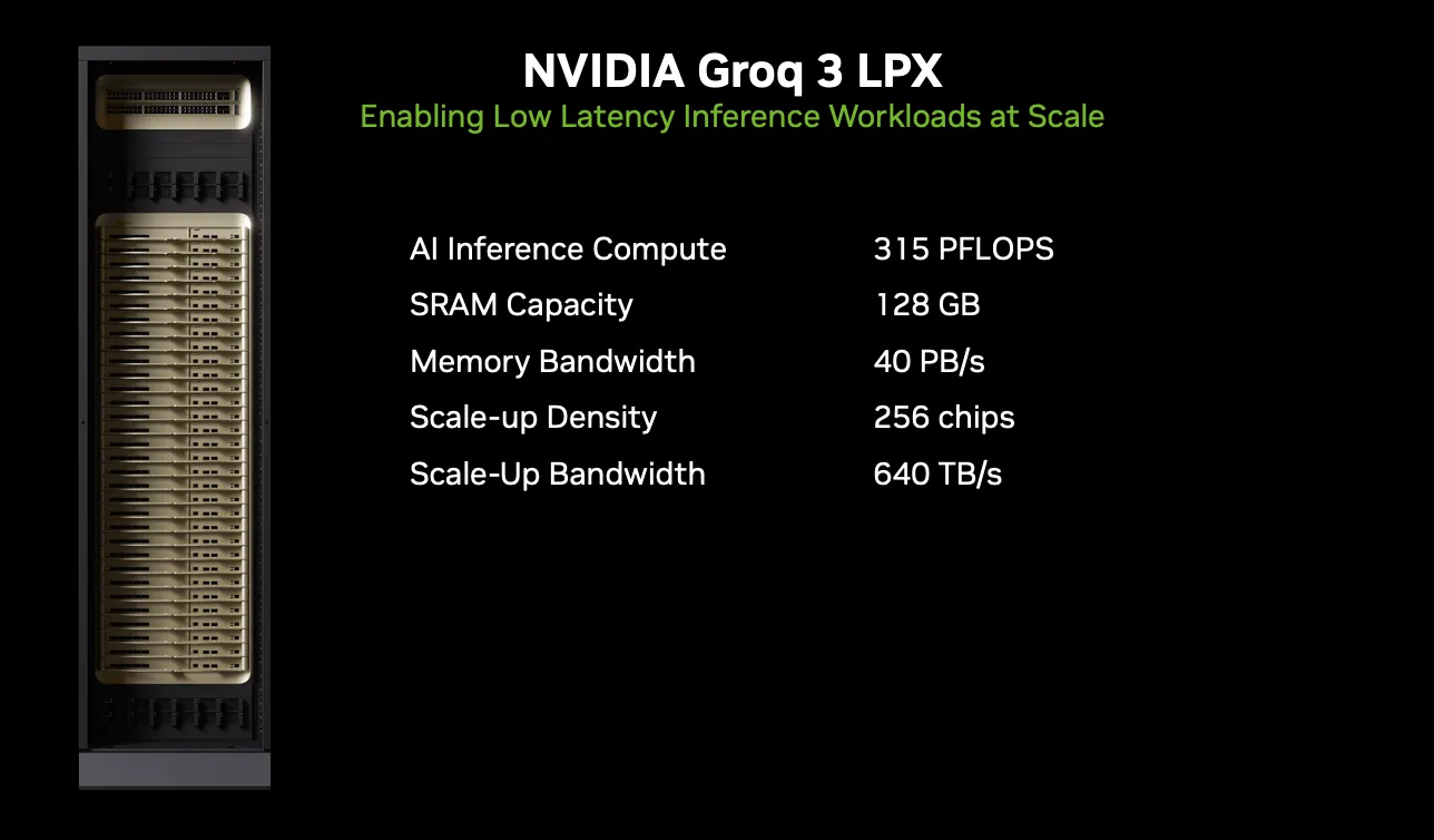 因此,整个 Groq 3 LPX 机架集成了 256 颗 LP30 芯片,片上 SRAM 合计 128 GB,这对应 40PB/s 的 SRAM 带宽,显著提升解码(IT之家注:输出生成)速度、降低响应延迟。
