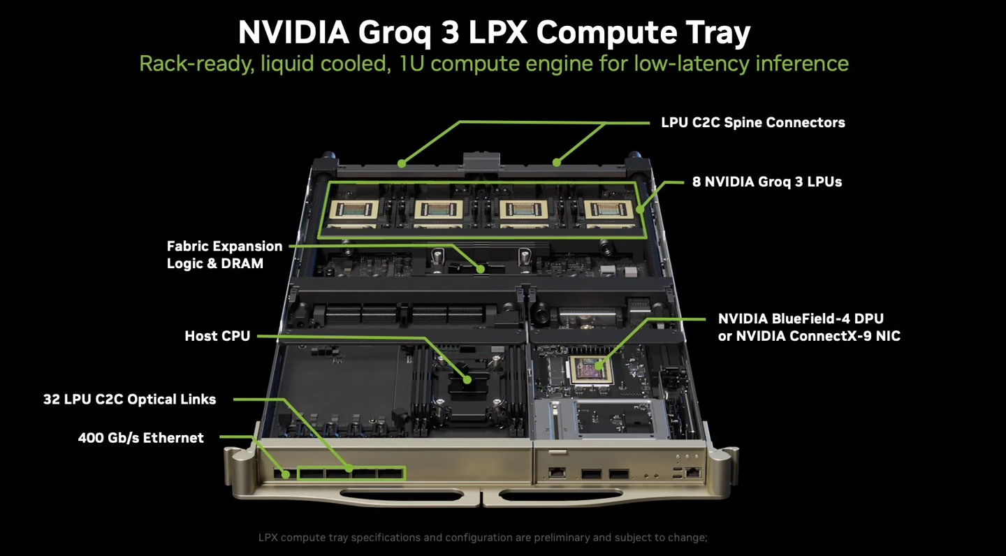 此外,每个 Groq 3 (LP30) LPU 芯片 96 条 112Gbps C2C 链路连接至系统其它部分,单一托盘通过结构扩展逻辑和头节点 CPU 可扩展合计 384GB 的 DRAM 内存,以满足系统互联的需求,在片上 SRAM 不足以覆盖任务需求时提供后援支持。