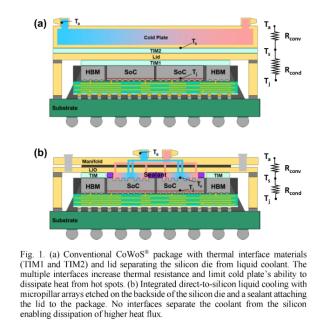 据悉,英伟达尝试在硅片上制作微流道,并计划将金刚石铜散热盖同步制成微流道结构,实现“芯片-散热盖-液冷”一体化设计。这一整合方案是对传统CoWoS封装散热体系的彻底优化:传统CoWoS封装存在热界面材料(TIM1、TIM2),且硅芯片与冷却液之间有盖板阻隔,多重界面大幅增加了热阻,限制了冷板对芯片热点的散热能力;而集成式硅片直冷方案,通过在硅芯片背面蚀刻微流道,并采用密封材料将金刚石铜微流道盖板与封装无缝连接,直接消除了冷却液与硅片之间的阻隔界面,实现了更高热流率的高效散热。但焊接工艺复杂度和芯片可维护性可能是需要克服的关键挑战。