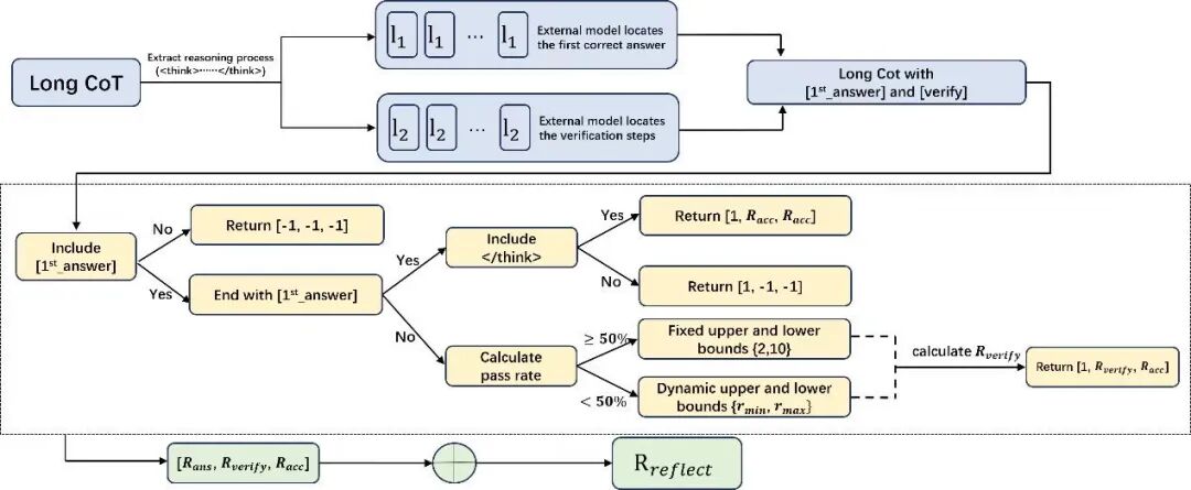 对此,Yuan 3.0 Ultra引入的反思抑制奖励机制(RIRM),恰恰是对“长思维链崇拜”的一次精准纠偏。它不是简单粗暴地截断输出,而是通过强化学习训练,让模型学会区分两种状态:什么时候需要继续推理,什么时候已经可以停止。研究团队将最大可接受反思步数设为3,理想状态下鼓励直接响应,复杂问题允许适度反思,但一旦超过阈值,奖励机制就会启动抑制。