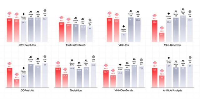 这些benchmark对应不同的能力维度:SWE Bench和VIBE-Pro更接近真实的软件工程任务,而Toolathon和MM-ClawBench则强调模型在复杂流程中的执行能力;相比之下,MLE-Bench等测试则更偏向算法与研究能力。