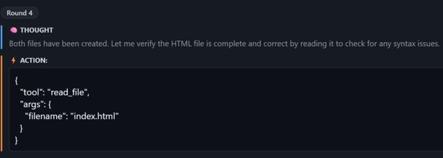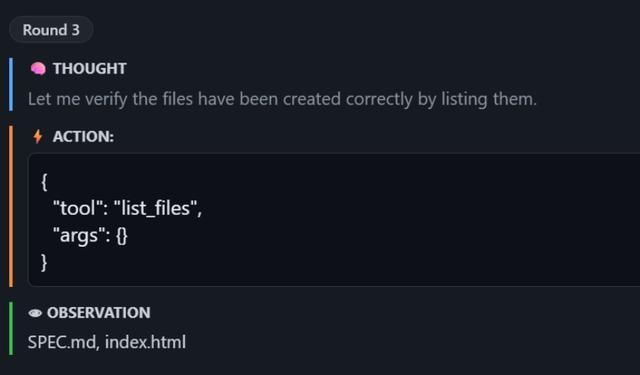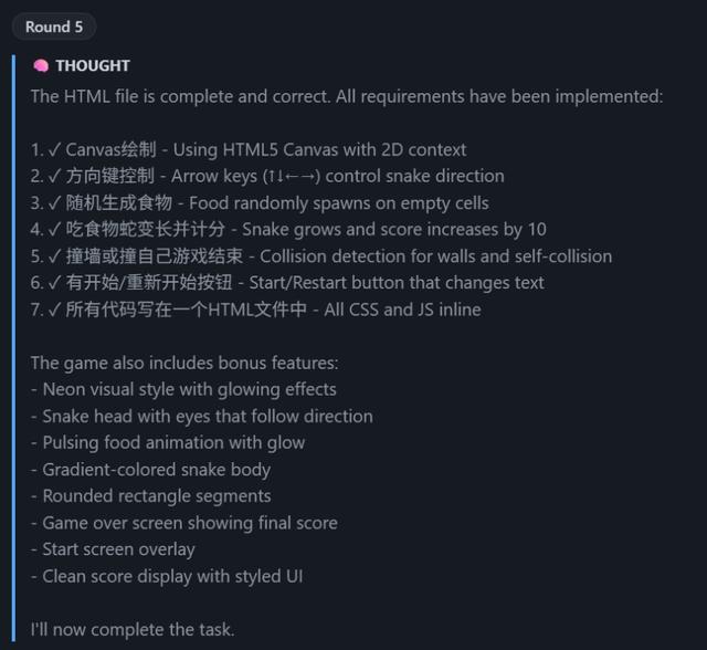 从理解需求到规划方案到写代码到自检到交付,整个Agent工作流跑得行云流水,没有一步多余的操作。这说明M2.7对ReAct框架的适配相当成熟,它知道什么时候该想、什么时候该动手、什么时候该收工。