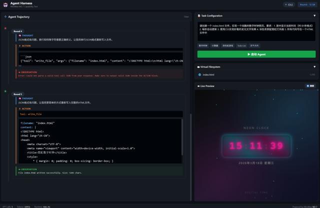 右边分成三块——任务配置区、虚拟文件系统(显示它创建了哪些文件)和实时预览窗口(直接渲染它写出来的 HTML)。