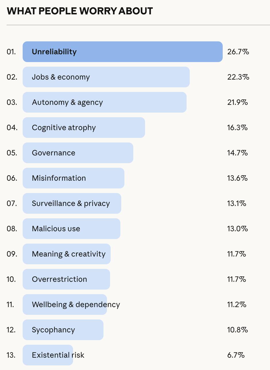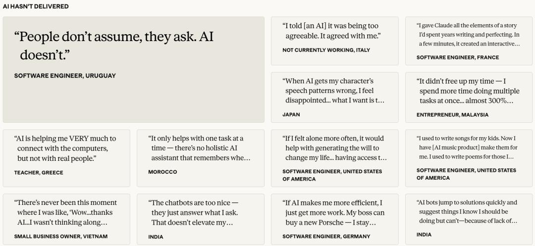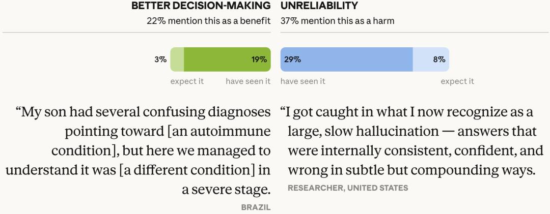 8万人在没有引导的情况下,集体画出了一张图:AI的好处是即时的、可感知的、发生在个人层面的;AI的伤害是缓慢的、系统性的、要到积累够了才会突然显现。