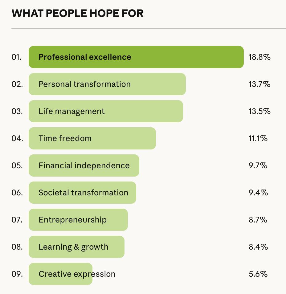 表面数据显示,18.8%的人希望「职业卓越」——让AI处理杂活,自己做更有价值的工作。