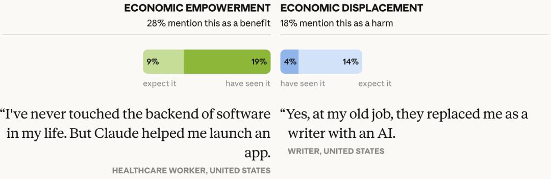 28%的人因AI获得了经济机会,18%害怕被替代。一个写作者说:「是的,在我之前的公司,他们用AI替换了我。」自由创意者最撕裂——23%体验过真实收益,17%经历过真实的生存威胁。好处和伤害几乎互相抵消。