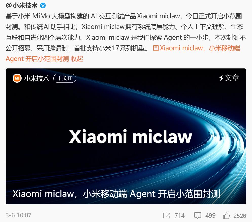 为此,小米在3月推出了MiclawAgent,虽然目前其发展仍停留在软件层面,但按小米的节奏,打通硬件壁垒、把它带上车,应该只是时间问题。