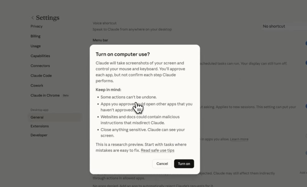 从最新的消息看起。3月24日,也就是前天,美国人工智能初创公司 Anthropic 发布的大型语言模型 Claude 发布了桌面端应用的计算机使用(computer use)功能,Claude 也可以操纵电脑执行任务了(不过目前仅 Pro 和 Max 订阅用户可用)。