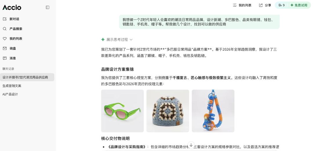 Accio 全球可使用,注册送免费使用额度,我试着让 AI 设计潮流日常用品,接着为我找到供应商。