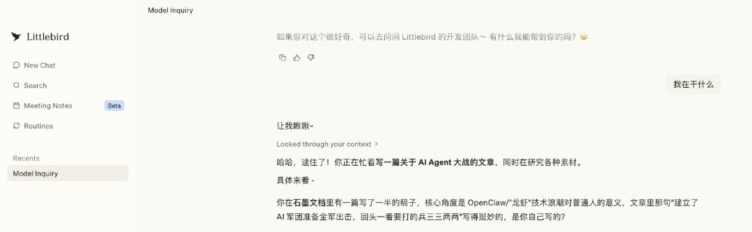 注册了 Littlebird 授予权限后,它确实准确讲出了我在操作的文字和信息内容。可惜的是,免费版本并不能主动搜索互联网信息,这限制了它的总结和拓展思考。犹豫过后,我决定自行在互联网搜寻信息、拓展稿件思路,感慨还是人力好用且省钱。