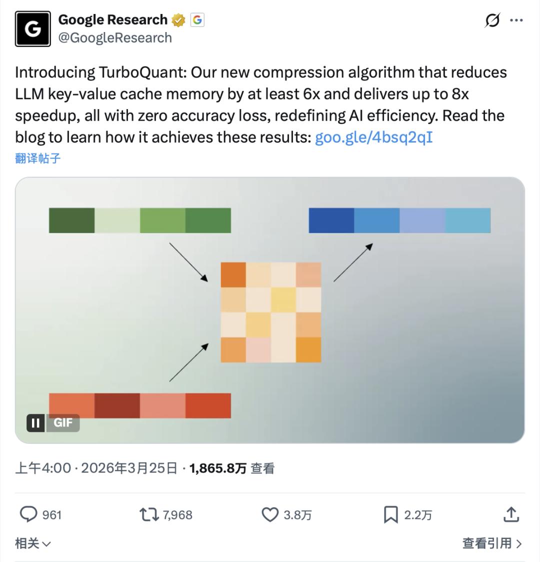 这个月的 24 号,谷歌研究院(Google Research)突然发帖,详细介绍一项名为 TurboQuant 的极端压缩算法。