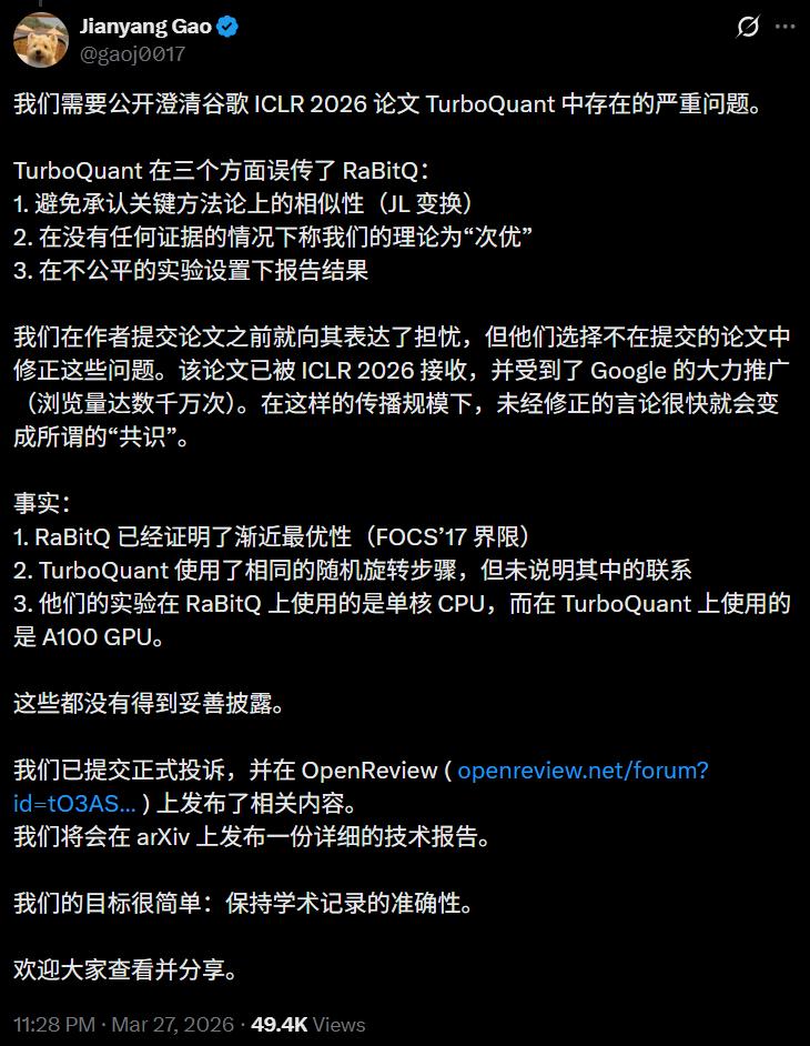 3月27号晚上10点,苏黎世联邦理工学院的博士后高健扬,在知乎、X 和 ICLR 评审平台上同步发文,指控当初 谷歌用来介绍 TurboQuant 算法的论文学术存在严重的学术不端。