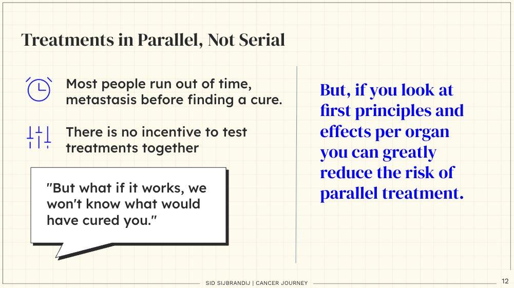 它意味着并行而非串行。 商业逻辑里,如果有十条路可能走通,你不会一条一条地测试,你会同时探索。Sid 把同样的逻辑用在了治疗上 —— 多种疗法并行,用数据快速评估,而不是一个接一个地等待结果,等到无路可走。
