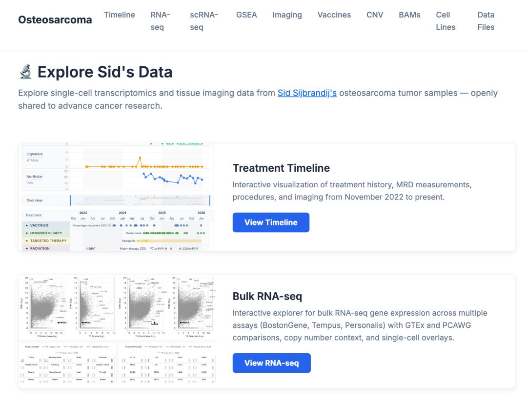 第一,极限诊断(Maximal Diagnostics)。像 GitLab 不放过任何一条信息一样,Sid 的原则是:能做的检测,全做,尽量频繁地做。不要等着知道「这个数据有什么用」再做 —— 先收集,再分析。他和团队建立了一份名为「Sid 健康记录」的文档(开源可读:osteosarc.com),仅 2025 年就已超过 1000 页。各种原始数据、扫描结果、基因组测序数据,全部存档,共有 25TB。