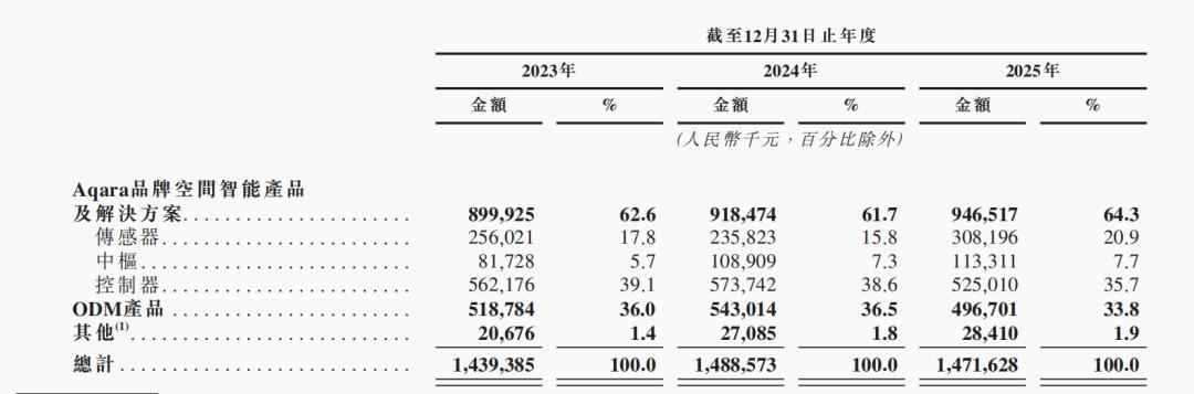 目前,绿米的主要业务包括Aqara品牌空间智能产品及解决方案和ODM产品。其中Aqara品牌空间智能产品及解决方案的收入从8.99亿元增至9.47亿元,占总收入的比例从62.6%升至64.3%。该自有品牌由三类硬件构成,分别是传感器、中枢和控制器。