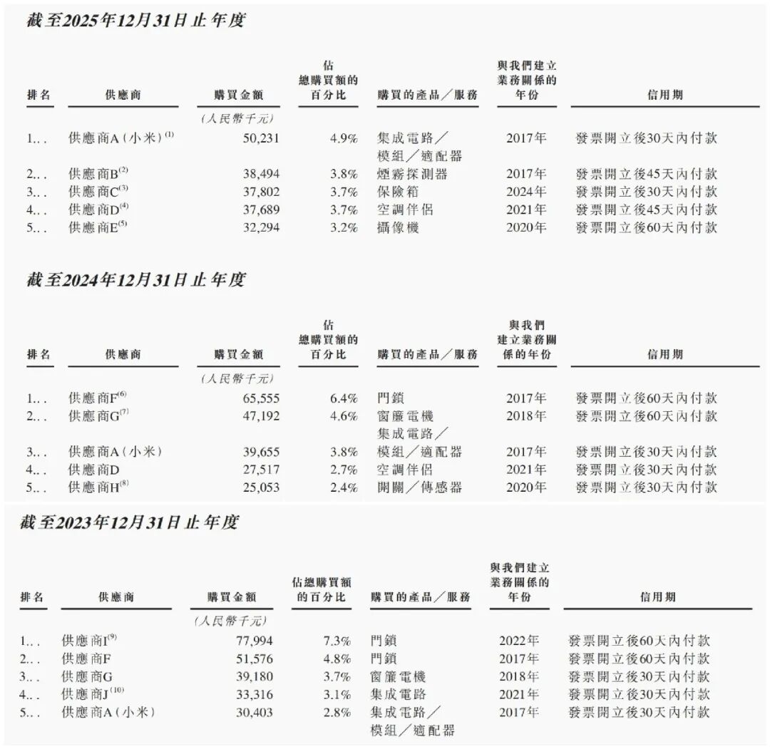 小米同样出现在绿米的供应商名单里,向绿米提供集成电路、模组和适配器,2023年至2025年采购额分别占总采购额的2.8%、3.8%和4.9%,金额从3040万元升至5023万元。
