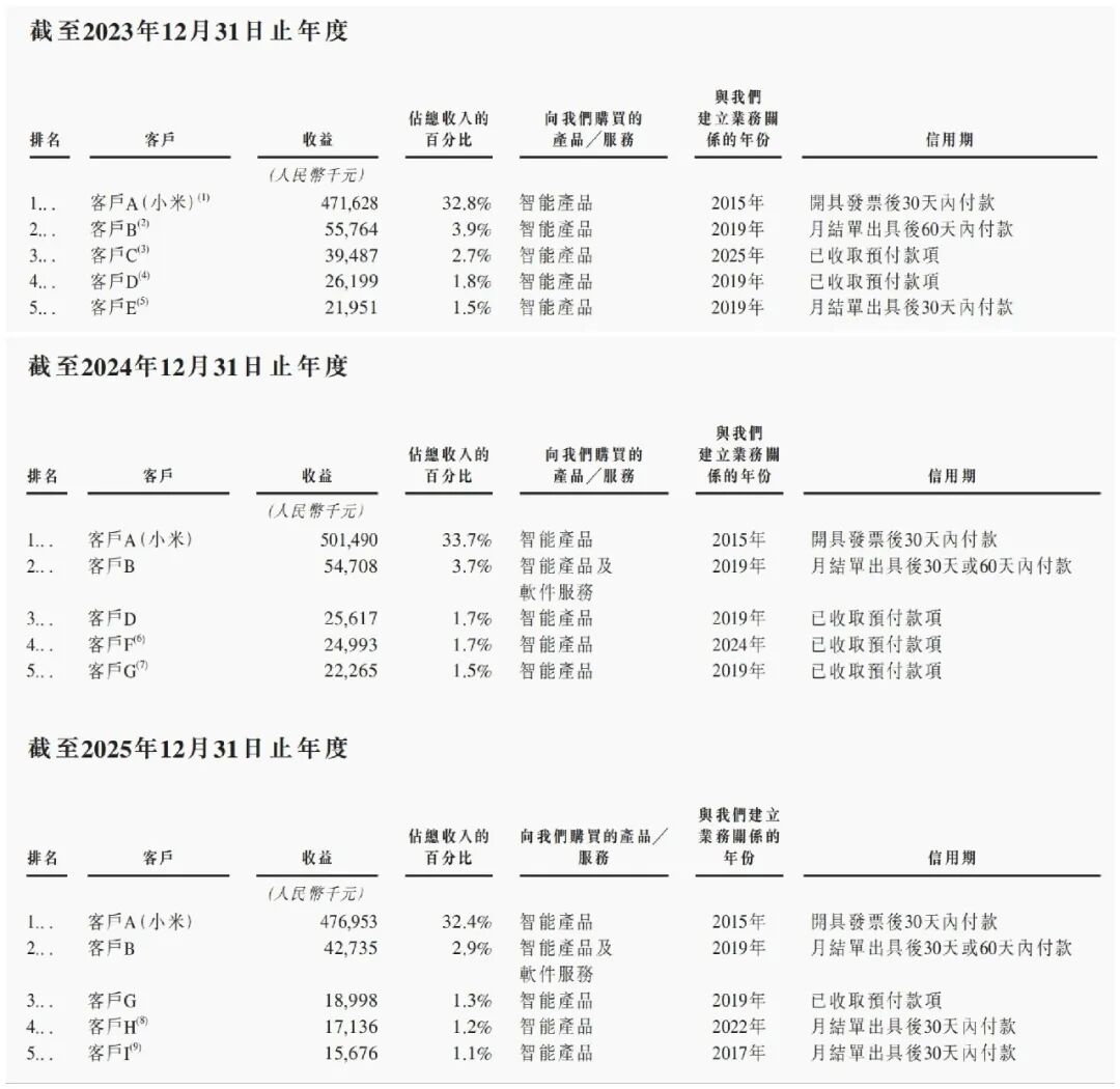 小米是绿米的单一最大客户,2023年至2025年,绿米来自小米的收入分别为4.716亿元、5.015亿元和4.770亿元,占当年总收入的32.8%、33.7%和32.4%,三年来这个比例几乎没有变化。2023年至2025年,绿米来自五大客户的合计收入分别为6.150亿元、6.291亿元和5.715亿元,占总收入的42.7%、42.3%和38.9%,2025年略有下降,主要是第二至第五大客户收入缩减。